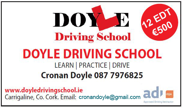 Doyle Driving School is a friendly and professional service, covering Carrigaline and surrounding areas. Cronan Doyle is a registered Road Safety Authority (RSA) qualified Approved Driving Instructor (ADI) providing the very best and most up-to-date one-to-one professional driving instruction available. Don't just take our word for it - check us out on Facebook ,X @cronandds or contact us on WhatsApp 087-7976825.